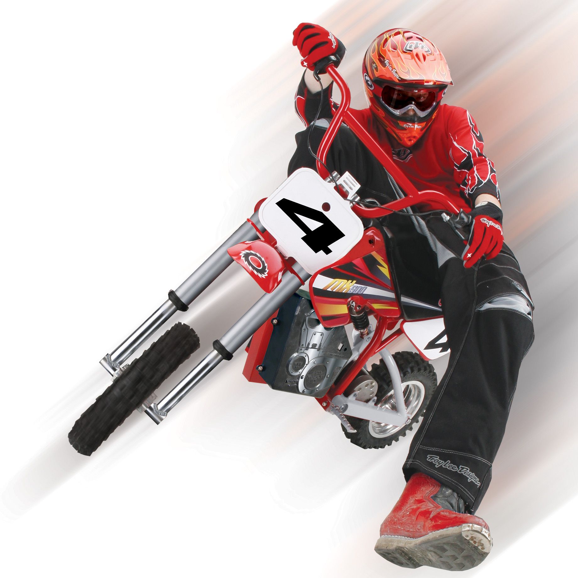 Decorations May Vary - RZR1035: Features: -Ideal for ages 14 and up-Scaled down Supercross design-Twist-grip throttle acceleration control-Double crown fork-Rechargeable battery-Folding metal foot pegs-Adjustable riser handlebars-Hand operated rear brake-Retractable kickstand-Decorations may vary-Can travel up to 10 miles in a single charge-Speeds up to 17 mph-High torque motor-Variable speed chain drive-Sixteen inch front, 14 inch rear pneumatic tires-Maximum rider weight is 175 lbs. Includes: -UL approved battery charger and tools included. Assembly Instructions: -Some assembly required. Dimensions: -Assembled Dimensions: 36" H x 24.5" W x 56" D.